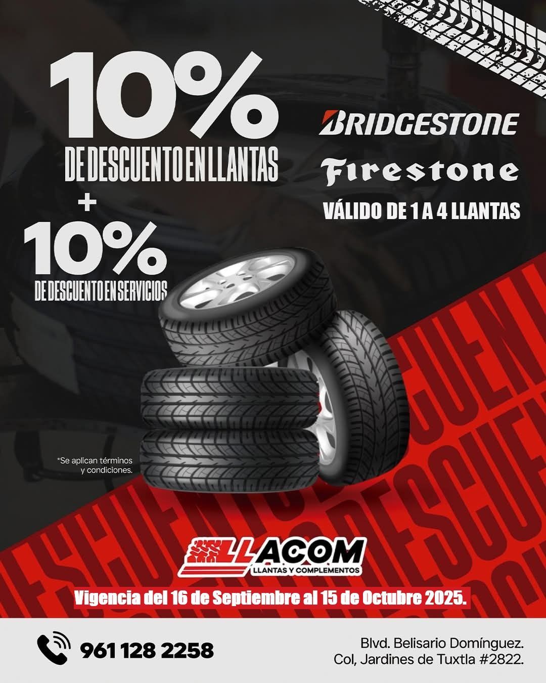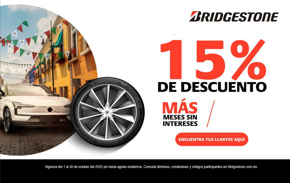 - 15% de descuento en la compra de 2 a 4 Llantas de las marcas Bridgestone & Firestone.